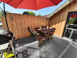 Für die schönen Sommerabende gibt es eine große Terrasse mit Gas-Grill. Gas ist natürlich inklusive.